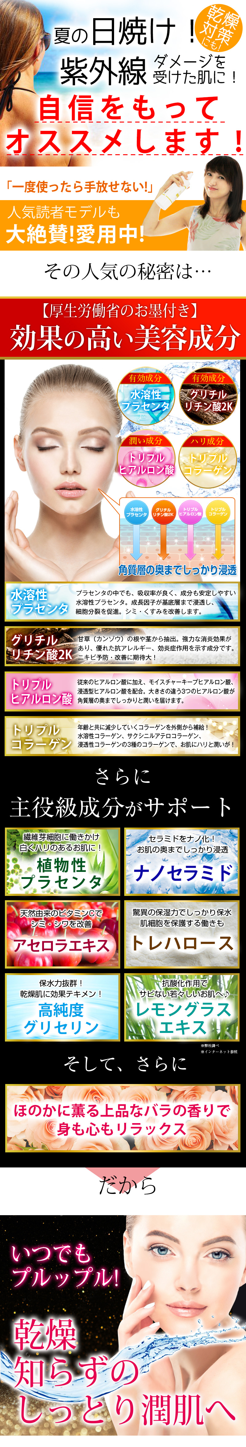 | 【有効成分】水溶性プラセンタエキス、グリチルリチン酸2K 【その他の成分】濃グリセリン、キサンタンガム、BG、メチルパラベン、フェノキシエタノール、クエン酸Na、無水クエン酸、グリコシルトレハロース・水添デンプン分解物混合溶液、水溶性コラーゲン液-4、サクシニルアテロコラーゲン液、加水分解コラーゲン末、アロエエキス-2、カッコンエキス、クロレラエキス、レモングラス抽出液、アセロラエキス、ヒアルロン酸Na-2、アセチル化ヒアルロン酸ナトリウム、加水分解ヒアルロン酸、水添大豆リン脂質、天然ビタミンE、ステアロイルフィトスフィンゴシン、POE(60)硬化ヒマシ油、ジイソステアリン酸ポリグリセリル、エチルヘキサン酸セチル、スフィンゴ糖脂質、ラウロイルグルタミン酸ジ(フィトステリル・オクチルドデシル)、香料 |
