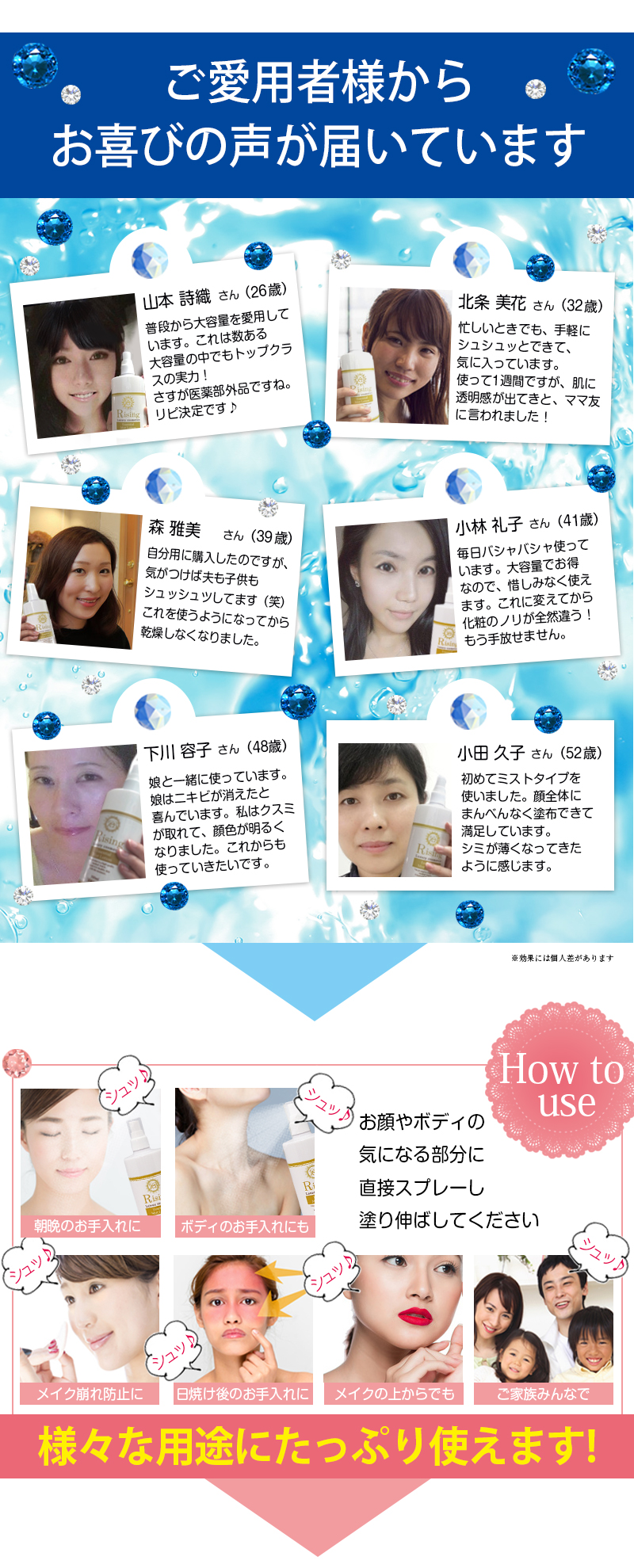 | 適量を手に取り、気になる部分にお使いください。 | |