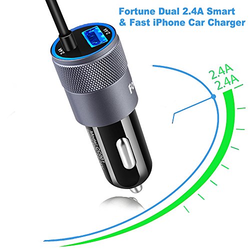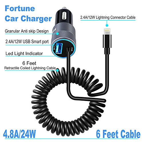 -. Feature : ✅Fortune car charger adapter can Charge Two Devices Simultaneously. The 6 Feet Retractable Coiled Lightning cable and universal USB port provide quickly could charge for two devices at the same time in the car, with input: 12V-24V; output maximum up to 4.8A (2.4A Max Per Port), it can automatically adapt the output to each one accordingly. / ✅Built-with 6 Feet Retractable Coiled Lightning cable can extend to 1.8m if pulled tightly while it naturally extends to approximately 0.25m, with first-rate shape retention, the Lightning cable is made by high purity oxygen-free copper core which ensures high speed transmission rate. Compatible with almost all Apple devices iPhone X/8/8 Plus 7/7 Plus/6s/6s Plus/6/6 Plus/SE/5s/5c/5/iPad/iPod, etc. / ✅The smart USB port could charging almost all brand mobiles such as Apple iPhones and devices, and also could charge Samsung Galaxy, Note, Nexus, HTC, Sony, LG, Tablet, navigators, digital cameras, tablets, MP3 players and more. / ✅Certified by CE & FCC will give you a fully safe and reliable using experience. It is compatible with all vehicle models' cigar lighter with DC 12-24V input, No interference issues for Radio, Bluetooth or Wi-Fi. Built-in smart IC technology prevents devices from overcharging, overheating and overcurrent etc. / ✅Excellent Design. Adopting and mixed with thousands buyers experience advices and other products advantage, Fortune car charger was special designed with compact, coiled retractable cable, non-slip pulling out, blue led indicator light etc., all those awesome characters will provide you a very convenience and happy daily life.