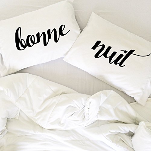 TOGETHER THEY ARE A PERFECT MATCH! A set of two (2) 20x30" couples pillowcases that have cool french script printed, "bonne" on the left pillow case and "nuit" on the right case, in black font as pictured. Fits standard and queen size pillow insert.