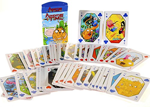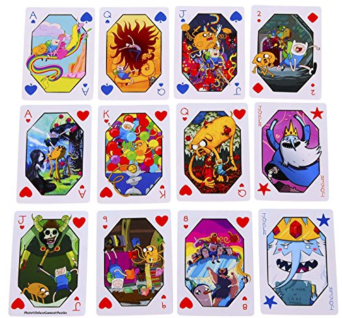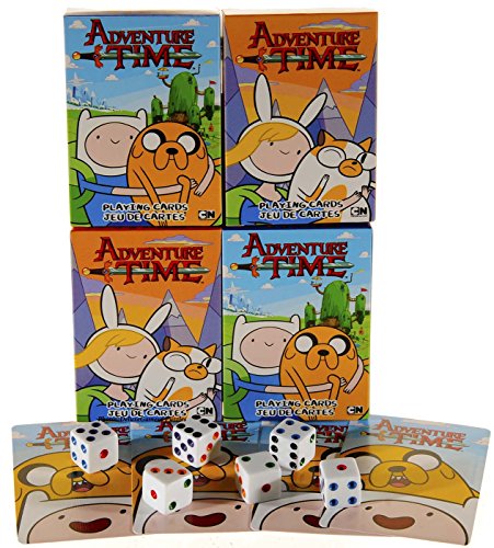 -. Binding : Toy -. Brand : Deluxe Games and Puzzles -. Color : 2 Pink Backings, 2 Blue Backings -. EAN : 0701017527053 -. Feature : Two Identical Decks of Adventure Time Playing cards with Jake & Finn on Box Cover. / Two Identical Decks of Adventure Time Playing cards with Fionna & Cake on box cover. / Each card features a unique piece of Adventure Time art in full color. / Bonus of six (D6) standard size white died with color dots (suitable for use with many popular games) / Poker size (2.5 x 3.5 inches), quality, plastic coated, full 54 card deck. -. Label : Deluxe Games & Puzzles -. Manufacturer : Deluxe Games & Puzzles -. MPN : NMR_AT_BUN4 -. PackageQuantity : 1 -. PartNumber : NMR_AT_BUN4 -. ProductGroup : Toy -. ProductTypeName : TOYS_AND_GAMES -. Publisher : Deluxe Games & Puzzles -. Studio : Deluxe Games & Puzzles -. Title : Adventure Time Playing Cards _ Bundle of 4 Decks (2 Styles) _ Plus Six Bonus White Dice -. UPC : 701017527053
