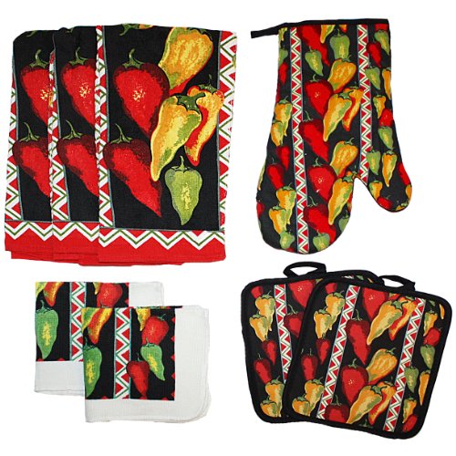 - Warm up your home by adding our fun and colorful 8 piece Hot Peppers towel set to your kitchen