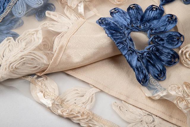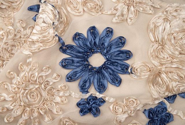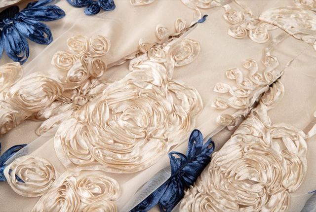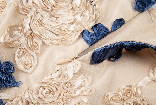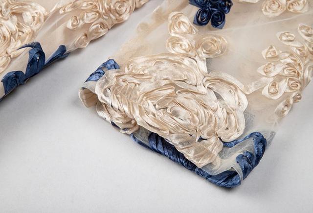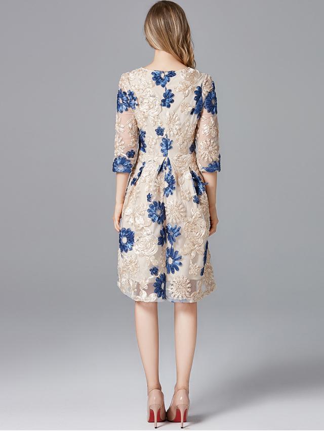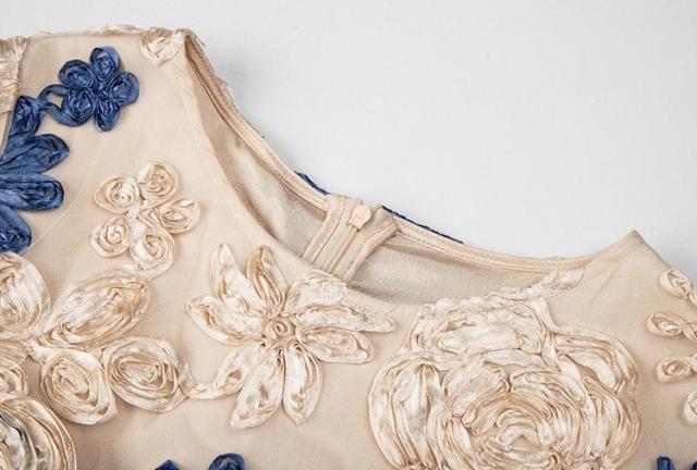 ゴールドの3Dの花刺繍を施したフレアのワンピースに青色の花も混ぜて、華やかさをアップ。
