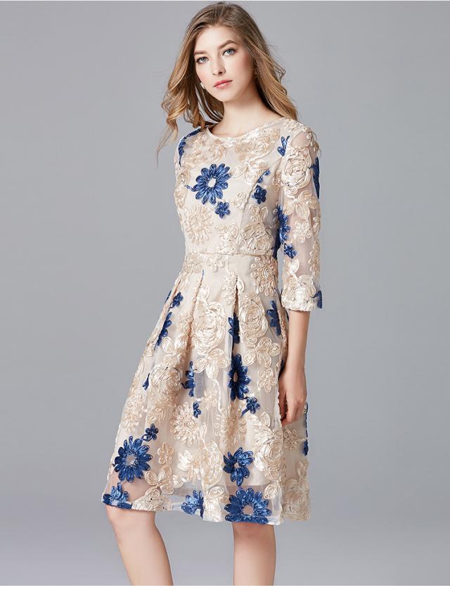 レース 3D刺繍 花刺繍 七分袖 長袖 ワンピース パーティードレス 結婚式 二次会 披露宴 パーティー デート 女子会 食事会 卒業式 謝恩会 親族 お呼ばれ フォーマル 演奏会 コンサート 発表会 膝下 大きいサイズ L 2L 3L 4L 5L ゴールド系 フレア 20代 30代