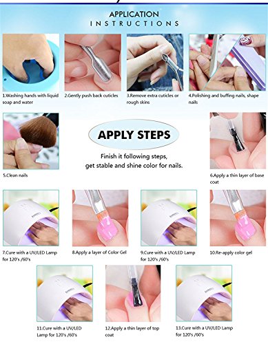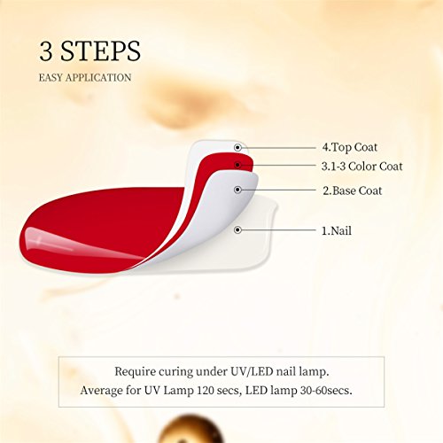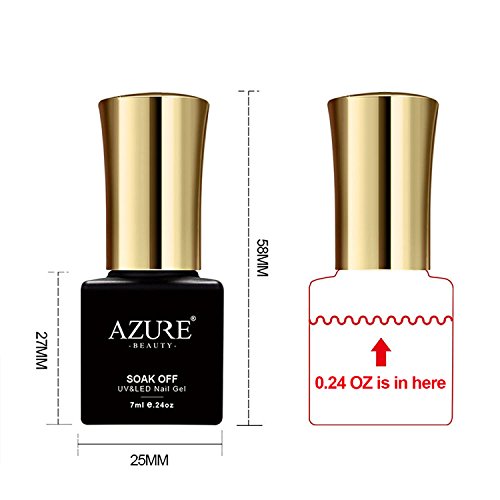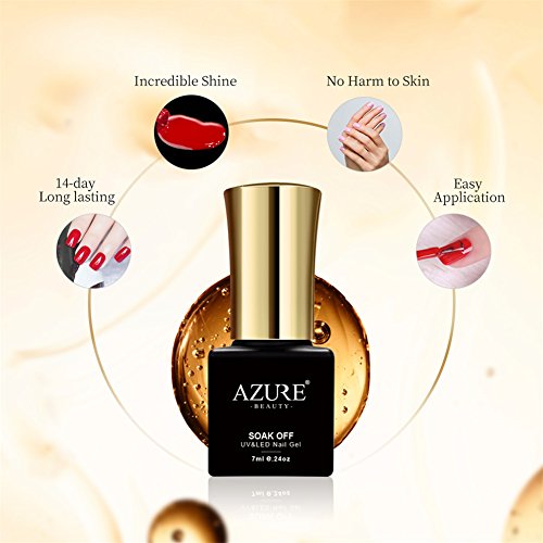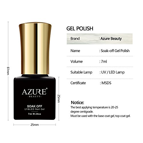 Features: Brand:Azure Beauty Quantity:8pcs Volume:7ml Note:The gel would be a little sticky in low temperature.Need to cure under UV LED lamp Direction: Step 1: Prep and push back cuticles. Step 2: Apply Base coat, and cure under UV lamp for 1 minute, LED light for 30 seconds. Step 3: Apply color?gel polish?in a thin application. Cure under UV lamp for 2 minutes, LED light for 30-60 seconds. Step 4: Apply a second coat, then cure under UV lamp for 2 minutes, LED light for 30-60 seconds. Apply the third coat if neccessary. Step 5: Apply No Wipe Top coat and cure under UV lamp for 2 minutes, LED light for 30-60 seconds. Step 6: Enjoy your 14 Day Manicure! How to remove: Step 1: Soak cotton pad with acetone. Step 2: Wrap around each nail with tin foil leave for approx 10 minutes, check if ready if not leave a few minutes more. Step 3: Use an orange stick or a cuticle pushier to remove softened gel. 0 |