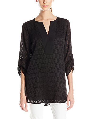 Three quarter roll tab sleeve split neck diamond jacquard blouse