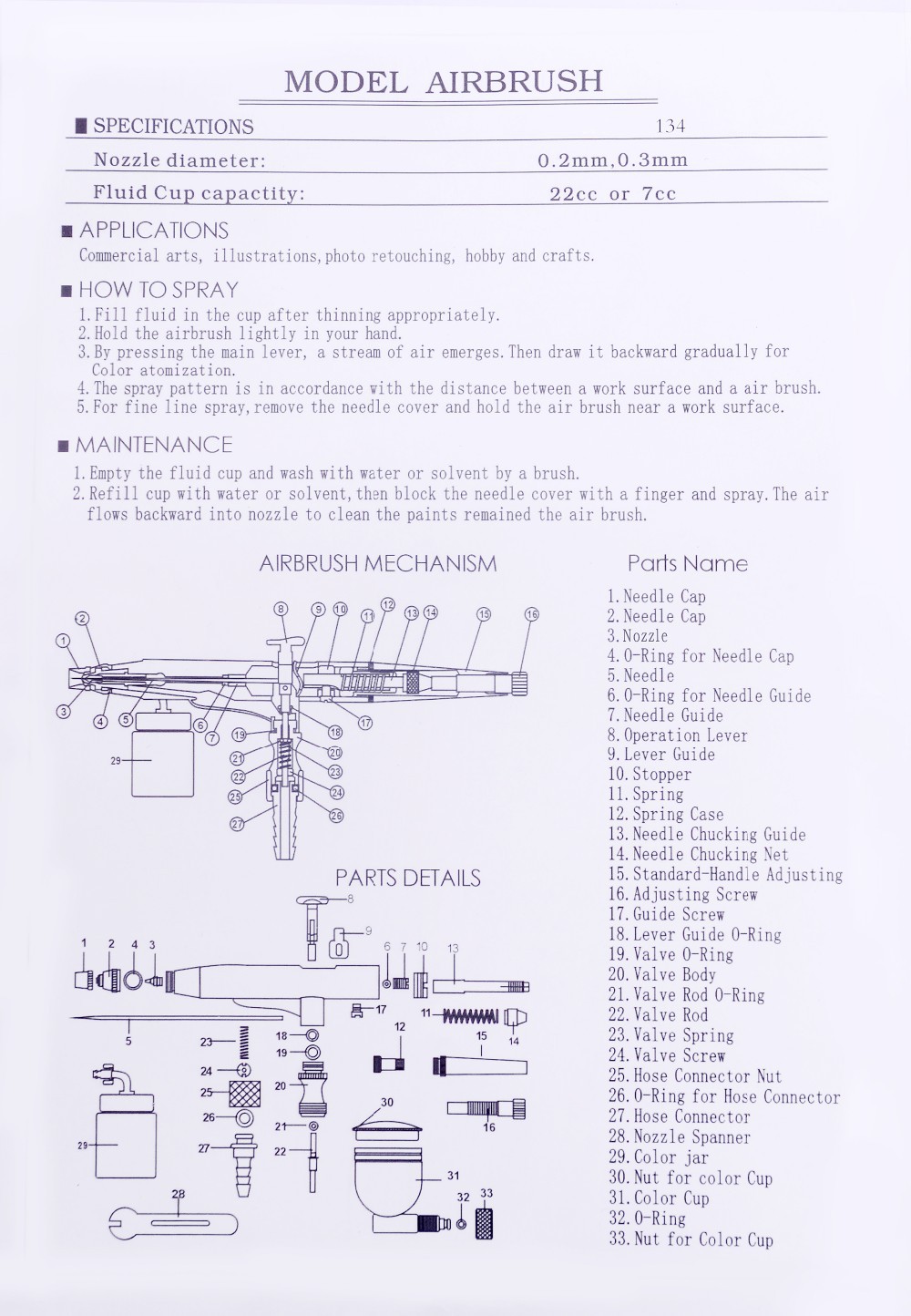 To prolong your airbrush gun\'s life span, please clean your gun in a proper way.It will be better to clean with water thinner like Alcohol after water paint. oil paint should be cleaned with oil thinner like ethyl acetate.