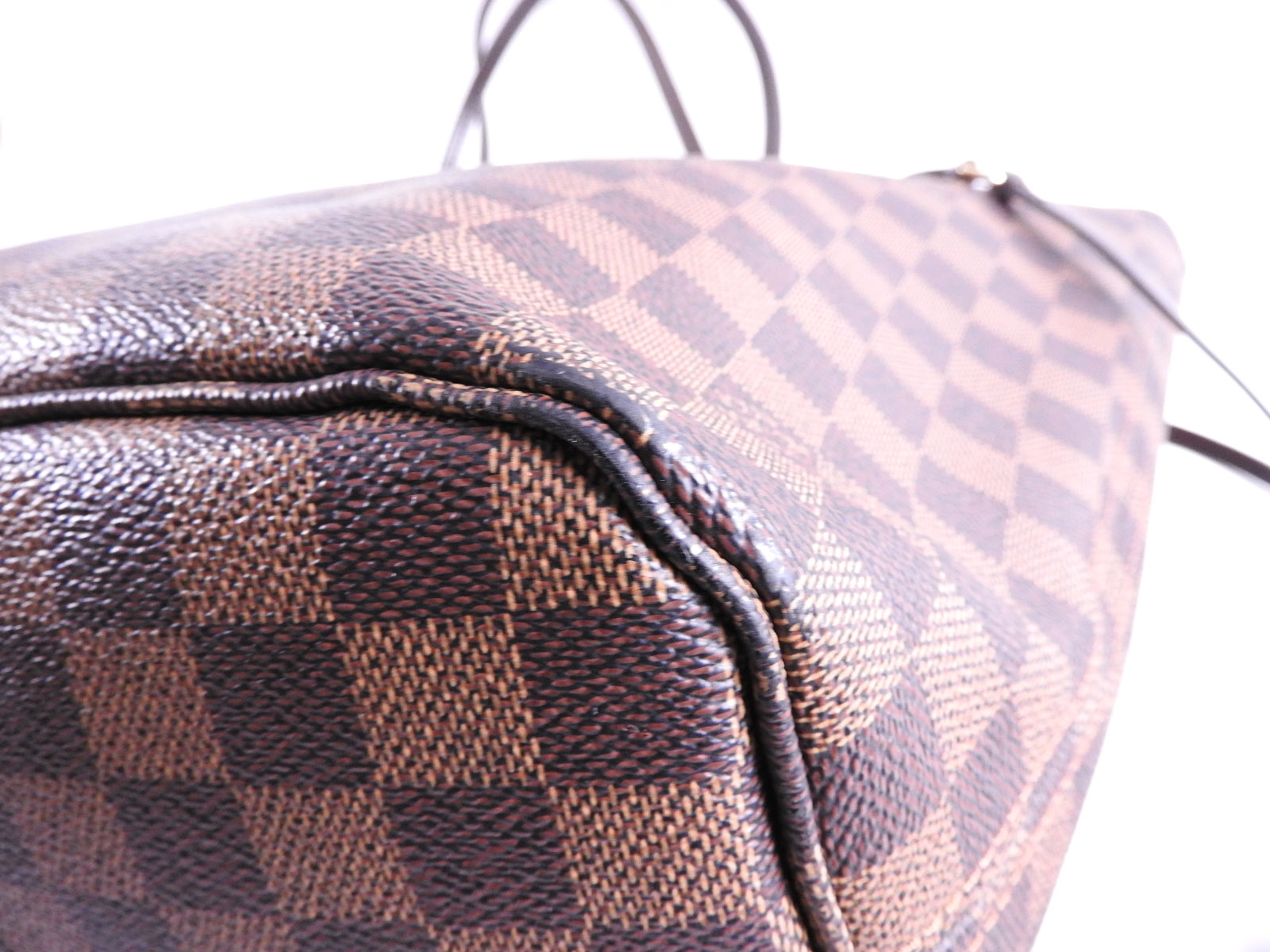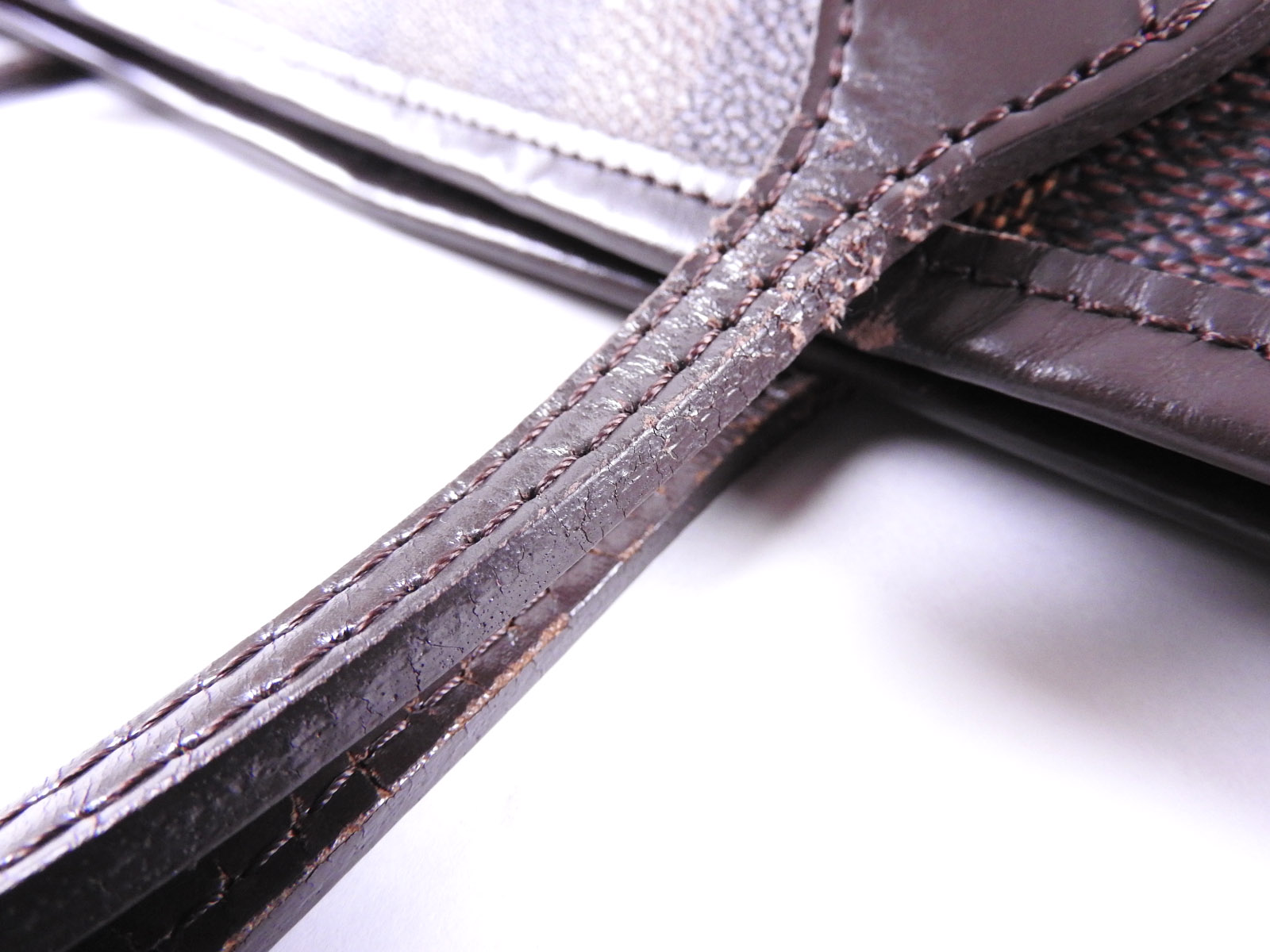 Damier canvas: Slightly used feeling. Slight stains. Leather: Used feeling. Small scuffs, wrinkles and abrasions in the trim around the top of the bag. |