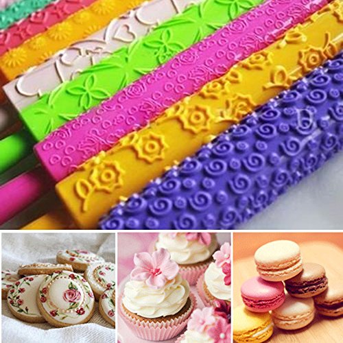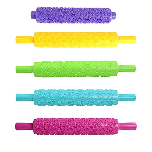 Package includes 5 patterned rolling pins to suit all occassions! Each set will include a blue pin in a butterfly pattern, a fushia pin in a hearts and roses pattern, a vibrant yellow pin with a daisy pattern, a purple pin embossed with a loop pattern and an emerald green pin with an elegant leaf design.