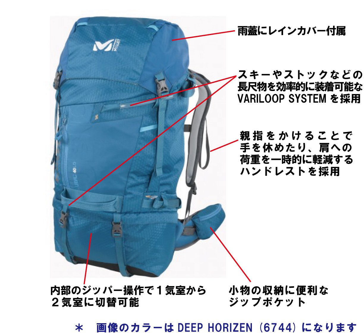 Equipped with "Variloop System" that can efficiently install long gears such as skiing and trekking pole