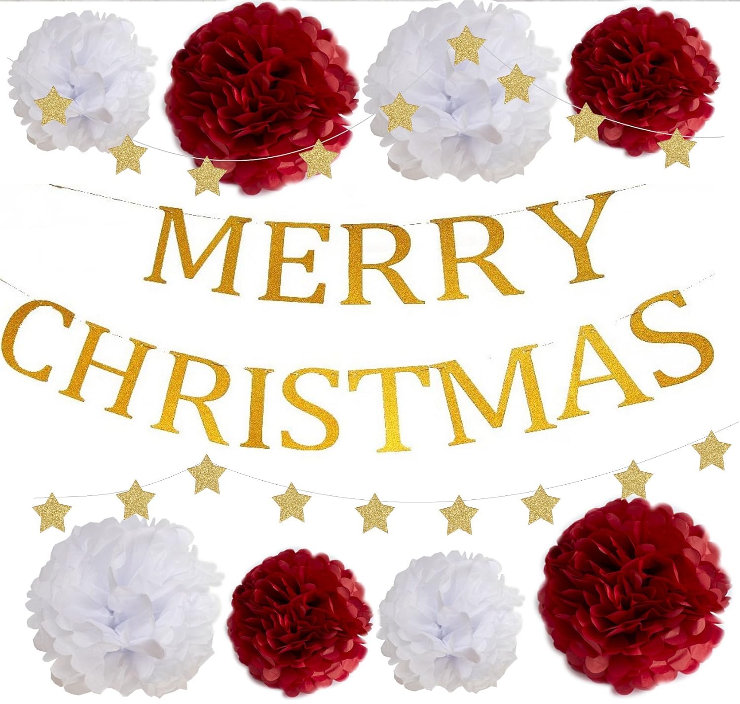 赤と白のポンポンがかわいいクリスマス飾り。パッと華やかな空間を演出します。 MERRYCHRISTMASガーランド:グリッターゴールド、サイズ15CM、紐が通してあります。 星ガーランド:表ゴールド・裏シルバー、星18個、紐が通してあります。 ペーパーポンポン:赤(30cm×2個、25cm×2個)、白(30cm×2個、25cm×2個) マスキングテープ、透明糸つき。ガーランドを壁に飾る際にマスキングテープをご使用ください。透明糸で天井からペーパーポンポンを吊るすと雰囲気が出ます。