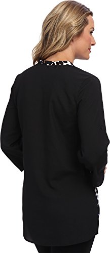 Printed top featuring solid-tone back and convertible half-sleeves with button-tab keepers