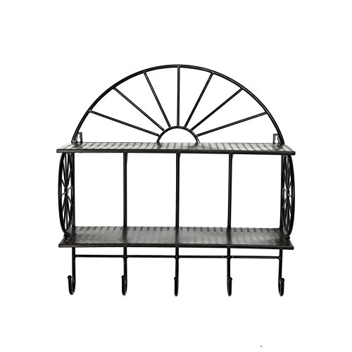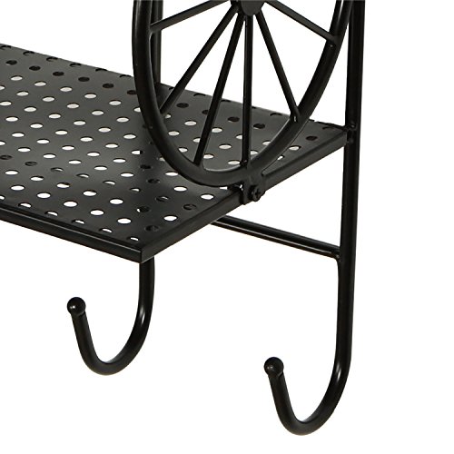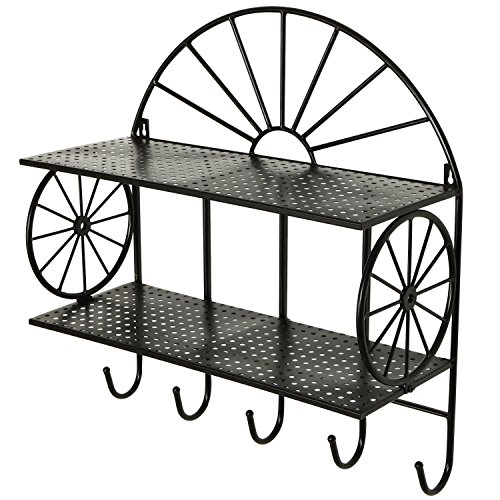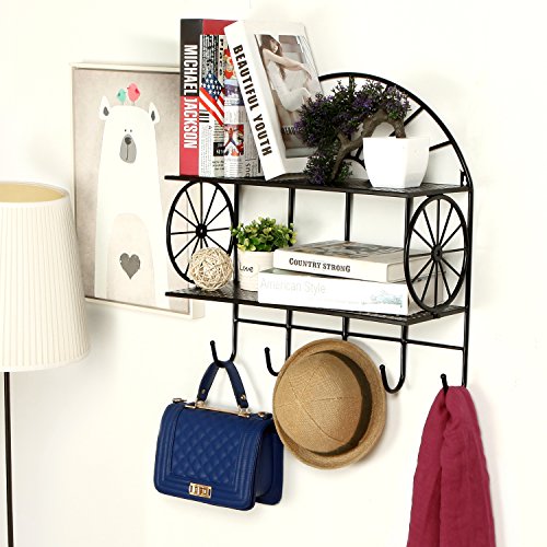 Wall Mounted 2-Tier Storage Shelf with 5 Utility Hooks, Coat Rack, Towel Hanger, Metal Wheel Design