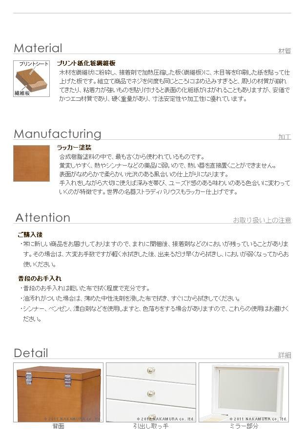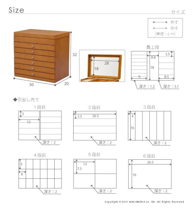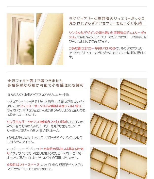 商品について:大容量なので、ジュエリーからアクセサリー、時計などをひとまとめに収納可能☆内部は、傷つかないようにフェルトが貼ってあるので安心♪1~5段は各段異なる仕切りの引出し、6段はフリースペースに計6段。多種多様なアクセサリー類をすっきり収納できます。ふた裏にはミラー付きで、セレクト&チェックに便利☆