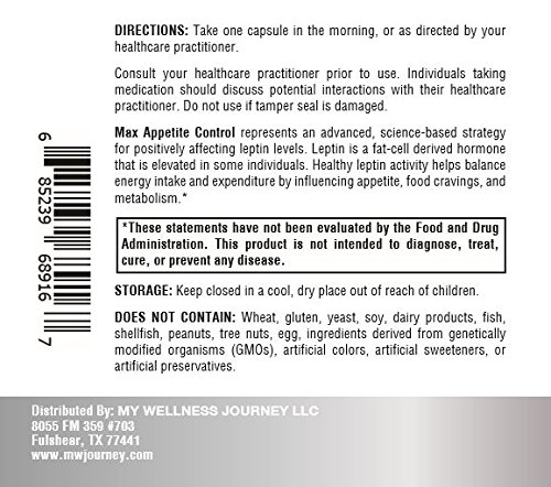 -. Binding : Health and Beauty -. Brand : My Wellness Journey -. EAN : 0685239689167 -. Feature : Supports Weight Loss* / Affects Synovial Fluid and Serum Leptin Levels* -. IsAdultProduct : 0 -. Label : My Wellness Journey LLC -. LegalDisclaimer : THE STATEMENTS MADE ABOUT PRODUCTS ON THE SITE AND THE CONTENTS OF THE SITE HAVE NOT BEEN EVALUATED BY THE UNITED STATES FOOD AND DRUG ADMINISTRATION AND ARE NOT INTENDED TO DIAGNOSE, TREAT, CURE OR PREVENT ANY CONDITION OR DISEASE. PLEASE CONSULT WITH YOUR OWN PHYSICIAN OR HEALTH CARE PRACTITIONER REGARDING THE SESTIONS AND RECOMMENDATIONS MADE ON THE SITE OR BY MY WELLNESS JOURNEY LLC, ITS REPRESENTATIVES OR EMPLOYEES. YOU EXPRESSLY AGREE THAT USE OF THE SITE IS AT YOUR SOLE RISK. NEITHER MY WELLNESS JOURNEY LLC, NOR ITS AFFILIATES, OFFICERS, DIRECTORS, EMPLOYEES, OWNERS, MANAGERS, AGENTS, THIRD-PARTY CONTENT PROVIDERS, MERCHANTS, SPONSORS, LICENSORS, OR THE LIKE (COLLECTIVELY, "ASSOCIATES"), WARRANT THAT THE SITE WILL BE UNINTERRUPTED OR ERROR-FREE; NOR DOES MY WELLNESS JOURNEY LLC OR ITS ASSOCIATES MAKE ANY WARRANTY AS TO THE RESULTS THAT MAY BE OBTAINED FROM THE USE OF THE SITE, OR AS TO THE ACCURACY, RELIABILITY, OR CURRENCY OF ANY INFORMATION, CONTENT, SERVICE, OR MERCHANDISE PROVIDED THROUGH THE SITE. THE SITE IS PROVIDED ON AN "AS IS, AS AVAILABLE" BASIS AND MY WELLNESS JOURNEY LLC AND ITS ASSOCIATES SPECIFICALLY DISCLAIM WARRANTIES OF ANY KIND, EITHER EXPRESSED OR IMPLIED, INCLUDING BUT NOT LIMITED TO WARRANTIES OF TITLE OR IMPLIED WARRANTIES OF MERCHANTABILITY OR FITNESS FOR A PARTICULAR PURPOSE. NO ORAL ADVICE OR WRITTEN INFORMATION GIVEN BY MY WELLNESS JOURNEY LLC OR ITS AFFILIATES SHALL CREATE A WARRANTY. -. Manufacturer : My Wellness Journey LLC -. MPN : MAXAC -. PackageQuantity : 1 -. PartNumber : MAXAC -. ProductGroup : Health and Beauty -. ProductTypeName : HEALTH_PERSONAL_CARE -. Publisher : My Wellness Journey LLC -. Studio : My Wellness Journey LLC -. Title : Max Appetite Control- Combat Food Cravings Naturally- Boost Metabolism and Appetite Control- Natural Leptin Manager Targeting Fat Cells- 30 caspsules -. UPC : 685239689167
