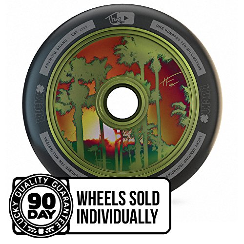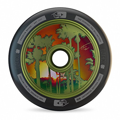 Studio : Lucky Scooter Publisher : Lucky Scooter Binding : Misc. Product Description The Lucky TFox Signature wheel 110mm is the most anticipated wheel in the industry and around the globe. These are LIMITED EDITION and in limited quantities so get yours while they are available. We start with 6061 aircraft aluminum and build a lightweight hollow core wheel and throw on some sick Tanner graphics along with his signature. We finish the wheel up by laying down the best urethane in the industry with Lucky Rebound Technology. We press in Lucky Speedroll bearings to exact specs for a smooth roll. Lucky continues to innovate and improve our processes to get the best wheels possible for all surfaces and are focused on feel, performance, and durability of our wheels. Lucky Rebound Technology (LRT) is a combination of high-performance urethane, a new pouring process, and a proprietary curing method which gives these wheels a grippy, fast, and buttery roll. Lucky Speedroll Bearings are included and installed! 0