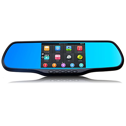 -. Feature : 5" Android Rear View Mirror + GPS Navigation + WIFI + FULL HD Dual 1080P CAR DVR + + FM Transmitter.Android Car Rear View Mirror with 5 Inch capacitive touch screen, GPS Navigation built in, Rotatable Dash Camera as well as a DVR system, and Wi-Fi receiver. Fitting right over your old rear view mirror, this Android mirror is an ultra high tech car gadget and super easy to install! / TVs, Fridges and even watches run Android, the Car Rear View Mirror Monitor couldn't stay behind. Not only will this mirror do what every other rear mirror monitor does such as recording video, playing music, guiding you to your destination, but adding in the Android operating systems you'll be able to play games, / surf the internet on your choice of mobile browsers, and download even more functions direct from Google Play. And with an Allwinner Cortex A33 Quad core processor, running your apps faster with a true pleasure! / 5 Inch Capacitive Screen Android4.4 Car Rearview Monitor / Mirror . Build-in Wifi Build in 512M DDR3/ 8G Flash. GPS Sat Navigation FM Transmitter streaming the online music from the mirror to your car stereo Dual HD 1080P Car DVR Digital Video Recorder Night Vision Camera / Package Included 1 x Smart Rear View Mirror 1 x Rear Camera 1 x Power Cable for Rear Camera 1 x Manual 1 x Car charger 2 x Rubber Rings