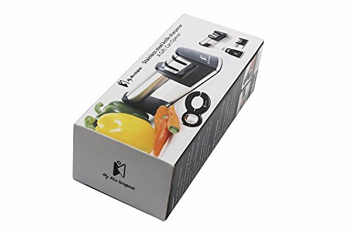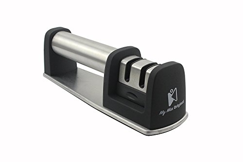 STYLISH & ERGONOMIC DESIGN - With its elegant design MyMia Original Knife Sharpener will give your work surface a stylish and classic look. Due to its compact and lightweight design it stores easily everywhere! Its ergonomic handle provides an easy grip that keeps your hand well protected during use. This high quality knife grinder designed with 2 stage sharpening rods system: A coarse stainless steel slot for dull or damaged knives and a fine ceramic slot for honing, polishing and touch-up.