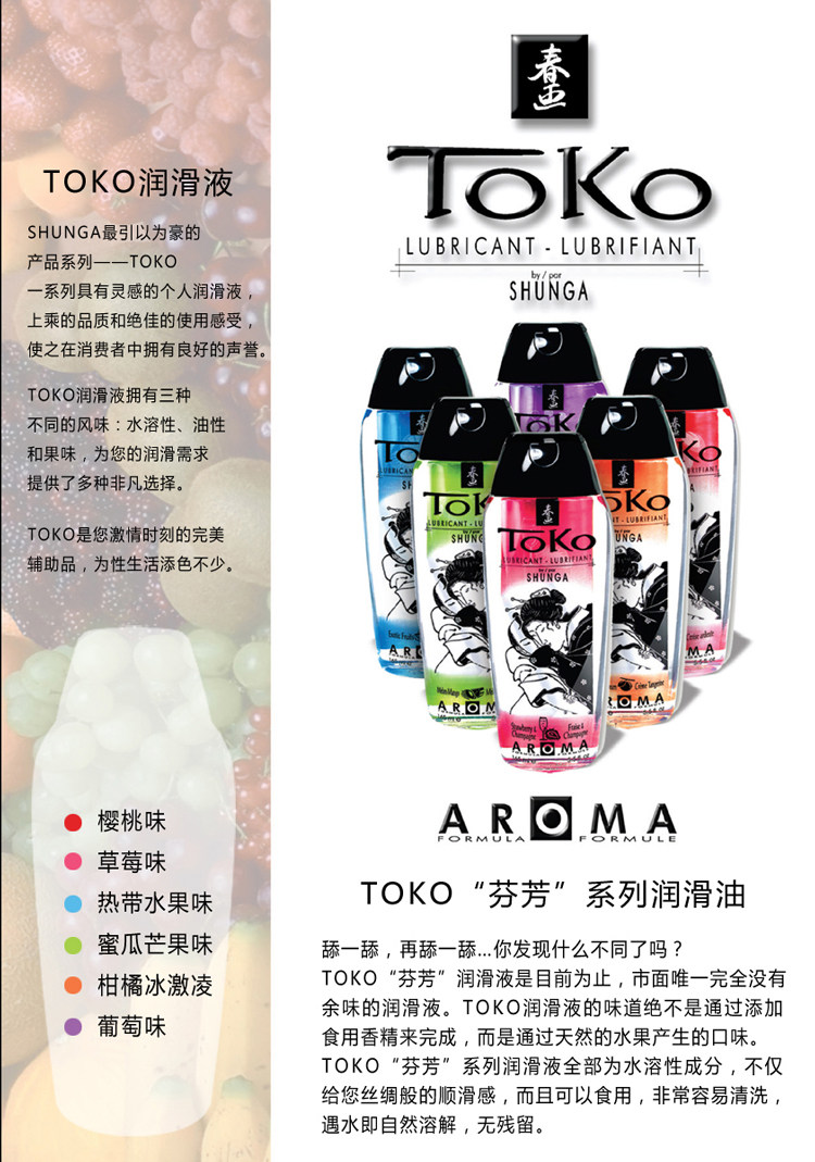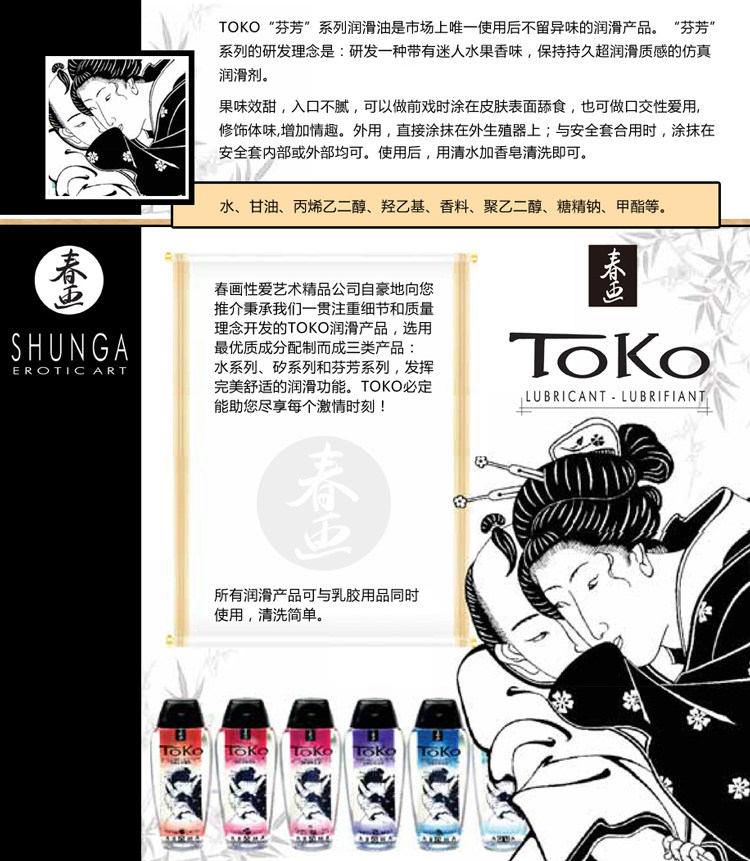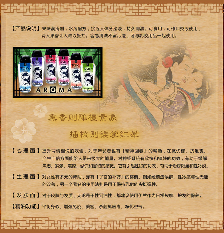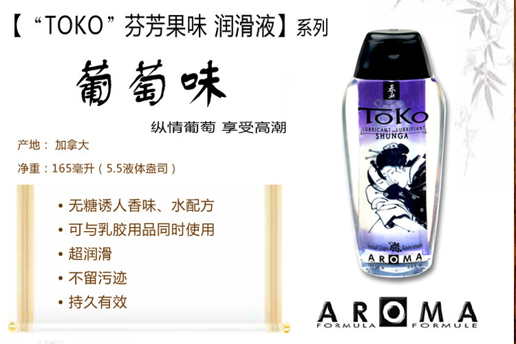 水溶性润滑液,接近女性自然分泌液,润滑效果自然持久。溶于水易清洗,可与乳胶用品同时使用。