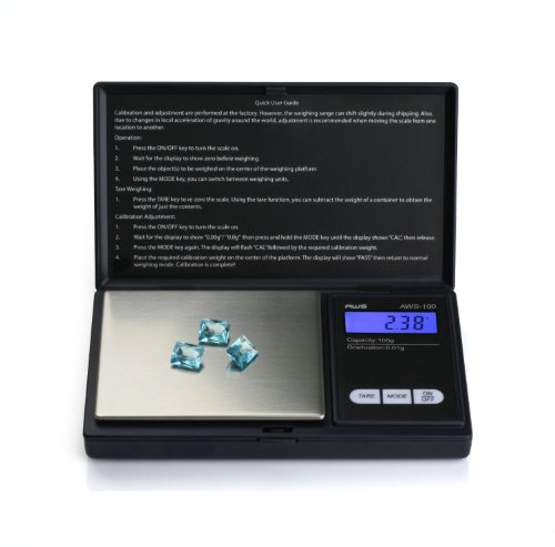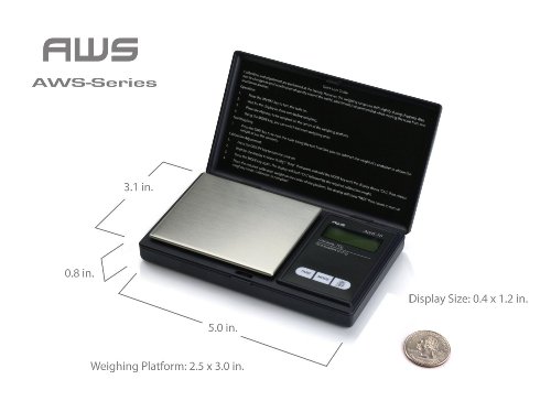 Studio : Seaside - American Weigh Publisher : Seaside - American Weigh Binding : Kitchen Product Description The AWS Series is a great durable and compact pocket scale for those who are seeking the on the go high-tech portable scale. The backlit LCD display helps make the numbers viewable and easy to read. The intuitive protective cover provides protection for the scale. With the smooth stainless steel weighing surface clean up is easy. Push buttons on the scale give you full control such as: switching modes grams, ounces, troy ounces, pennyweights and tarring. This checkbook size scale offers great range from 100 grams to as little as 0.01 of a gram. All scales backed by our 10 year warranty. Scale measures 3" x 5" x 0.8", platform measures 2.5" x 3" 0