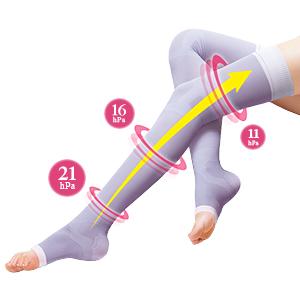 1.重度の血行障害がある方は使用しないでください。 2.次の方は着用前に医師にご相談ください。糖尿病、深部製脈血栓症、血行障害、うつ血栓心不全、炎症性疾患、装着部位の神経障害などで治療を受けている方。 3・着用にあたり、次のことを注意してください。 (1)サイズが合わないものや2枚重ねての着用はしないでください。 (2)使用中にしわやたるみができないようにしてください。 (3)ひざ下、ひざ裏で生地が丸まらないように伸ばしてください。口ゴムは折り返さずまっすぐのままはいてください。 4.気分が悪くなったり、痛みやしびれなどの不快感、かゆみ、発疹等異常を感じたばあいは直ちに使用を中止してください。 5.製品の変形を防ぐために、ねじれた状態でのご使用や保管をしないでください。 ※妊娠中の方は、着用を始める前に医師に相談されることをお勧めいたします。 ※妊娠中の合併症を伴う方は、着用前に必ず医師にご相談ください。 ※妊娠中、本品を着用し異常を感じた場合はすぐに専門医にご相談ください。 足首は寝ている姿勢にあわせたフラット設計。 つま先なしなので、お休み中の熱を発散します。 幅広リブでずれにくく、寝返りを打っても安心です。 また、コットンフィールの新素材により、着圧はそのままにやわらかな肌ざわりを実現しました。 ・着用前に指輪等をはずし、手足の爪をなめらかにしてください。 ・爪を立てたり、一気に引き上げないでください。 ・サポートカがあるため、注意しながらゆっくり引き上げてください。