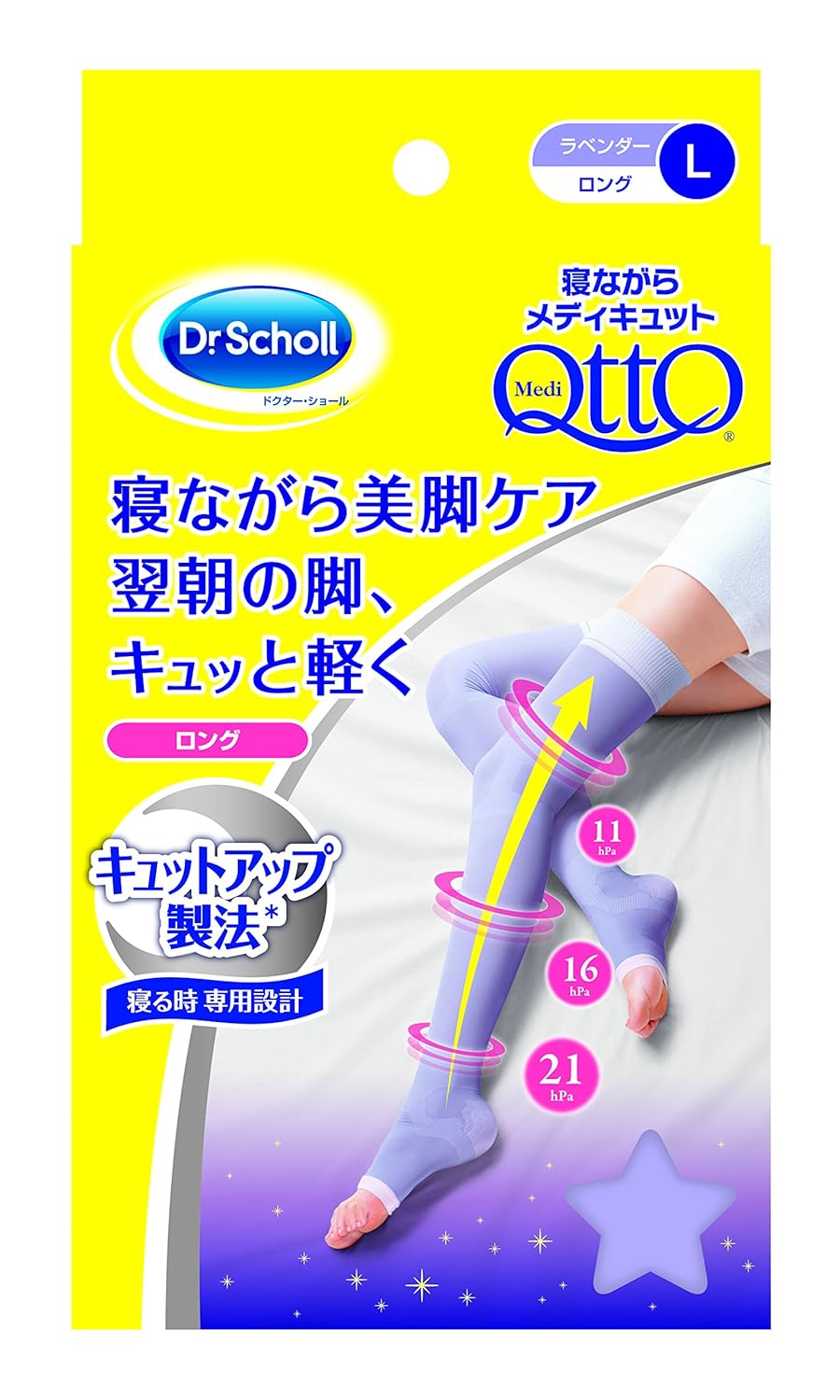 はくだけで脚をキュッとひきしめ軽くする着圧ソックスです。 寝るときに適した低めの着圧値で効果的にひきしめ、翌朝の脚をすっきりさせます。 ロングタイプなので、脚全体をじっくりケアします。