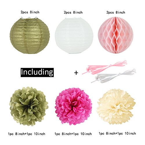 - Package included: 4pcs 20cm(8inch) paper lanterns(gold,white,each has 2pcs),2pcs 20cm(8inch) rose pink honeycomb balls,3pcs 20cm(8inch) paper pom poms flowers(gold,hot pink,ivory),3pcs 25cm(10inch) paper pom poms flowers(gold,hot pink,ivory)