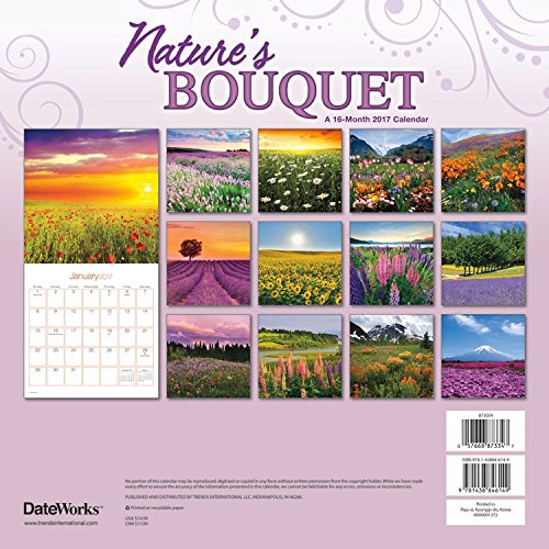 -. Binding : Office Product -. Brand : Trends International -. EAN : 0709257563787 -. Feature : 2017 Calendar featuring beautiful full color photographed images for every month of the year. / Includes Holidays and Observances. / Keep your appointments and Birthdays organized in one place! / Perfect for office spaces, bedrooms, classrooms and more! / Makes a great gift for friends and family! -. Label : Trends International -. Manufacturer : Trends International -. MPN : 873034 -. NumberOfItems : 1 -. PackageQuantity : 1 -. PartNumber : 873034 -. ProductGroup : Office Product -. ProductTypeName : OFFICE_PRODUCTS -. Publisher : Trends International -. Studio : Trends International -. Title : 2017 NATURE'S BOUQUET - 12 X 12 Wall Calendar -. UPC : 709257563787