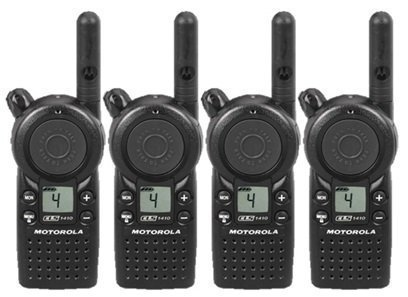 -. Binding : Electronics -. Brand : Motorola -. EAN : 0738613621144 -. Feature : 4 radios and associated accessories sold for $716.00 by All Charged Up. / Each of our radios comes complete with a single-unit charger, 18 hour lithium ion battery, swivel belt holster, 1-year warranty through us, free shipping via UPS ground, and guaranteed support from our team of radio experts. / 1-watt (covers up to 15 floors, 200,000 square feet range), 4 channel (communication groups). Set to factory default UHF frequencies (good for both inside and outside use). / Very small, lightweight, and simple. Our best selling model. Popular for a variety of smaller footprint businesses. For questions, give us a call or shoot us an email. -. Label : Motorola Solutions -. Manufacturer : Motorola Solutions -. PackageQuantity : 1 -. ProductGroup : Car Audio or Theater -. ProductTypeName : TWO_WAY_RADIO -. Publisher : Motorola Solutions -. Studio : Motorola Solutions -. Title : 4 Pack of Motorola CLS1410 Two Way Radio Walkie Talkies (UHF) -. UPC : 738613621144