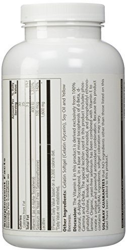 -. Binding : Health and Beauty -. Brand : Solaray -. EAN : 0076280416923 -. Feature : Made from 100 percent natural, unesterified d-altha-tocopherol / Not only fight free radicals with vitamin E but that it also helps improve memory and increase cognitive capacity / Has 100 mcg of selenium to help with the bioavailability of the vitamin E -. IsAdultProduct : 0 -. Label : Solaray -. LegalDisclaimer : These statements have not been evaluated by the Food & Drug Administration. This products is not intended to diagnose, cure, mitigate, treat, or prevent any disease. -. Manufacturer : Solaray -. Model : 076280416923 -. MPN : S41692 -. NumberOfItems : 1 -. PackageQuantity : 1 -. PartNumber : S41692 -. ProductGroup : Health and Beauty -. ProductTypeName : HEALTH_PERSONAL_CARE -. PublicationDate : 2014-10-04 -. Publisher : Solaray -. ReleaseDate : 2015-03-19 -. Size : 180 -. Studio : Solaray -. Title : Solaray Bio E with Selenium 400iu Supplement, 180 Count -. UPC : 076280416923