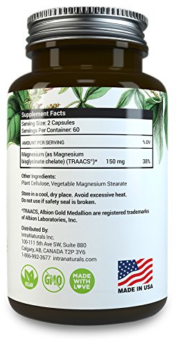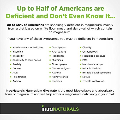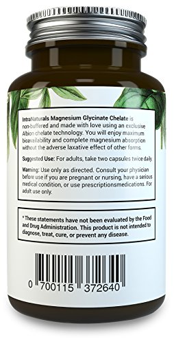 -. Binding : Health and Beauty -. Brand : IntraNaturals -. Feature : MAXIMUM ABSORPTION MAGNESIUM WITH NO LAXATIVE EFFECT - IntraNaturals Magnesium Glycinate contains pure, non-buffered elemental magnesium chelated with the amino acid glycine - which means the magnesium has been chemically bound to a glycine molecule. This facilitates efficient transport into the bloodstream through the intestinal wall, ensuring maximum bioavailability and complete magnesium absorption without the adverse laxative effects of other cheaper forms like Oxide and Chloride. -. Label : IntraNaturals -. Manufacturer : IntraNaturals -. PackageQuantity : 1 -. ProductGroup : Health and Beauty -. ProductTypeName : HEALTH_PERSONAL_CARE -. Publisher : IntraNaturals -. Studio : IntraNaturals -. Title : Magnesium