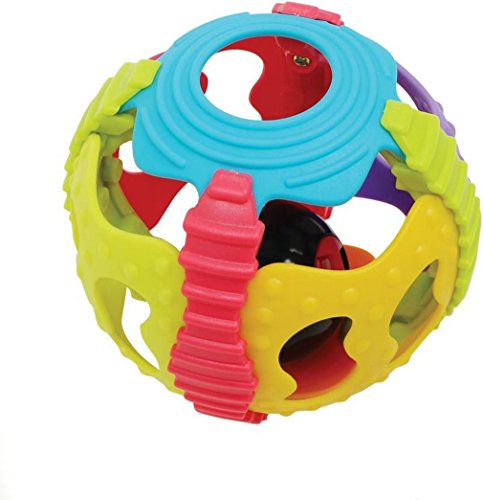 The Shake Rattle and Roll Ball offers a variety of textures with soft surfaces and vibrant colors. The colorful outer ball is bendable and soft while the small ball inside rattles when the ball is shaken, stimulating the baby's audio development. Watch your baby explore their developing motor skills as they roll, shake, and grasp the ball, learning and having fun while doing so!Feature