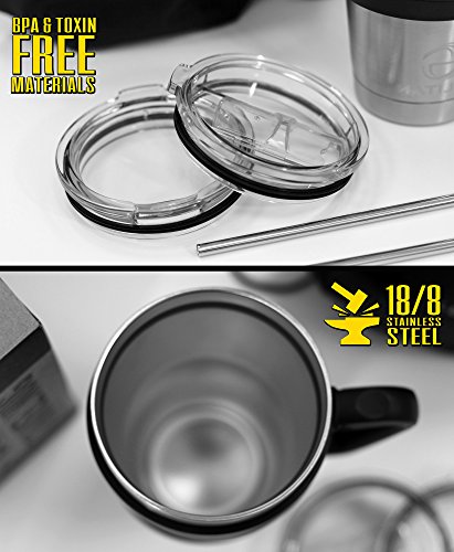 - ✔ PREMIUM QUALITY DOUBLE WALL VACUUM INSULATED CUP: The 30oz sweat-proof thermal mug included in the set is equipped with a double wall which provides the extreme temperature retention to keep your coffee, tea or cocoa hot and your icy beverages cold. Also, you can hold the tumbler safely without feeling any moisture, heat or cold.
