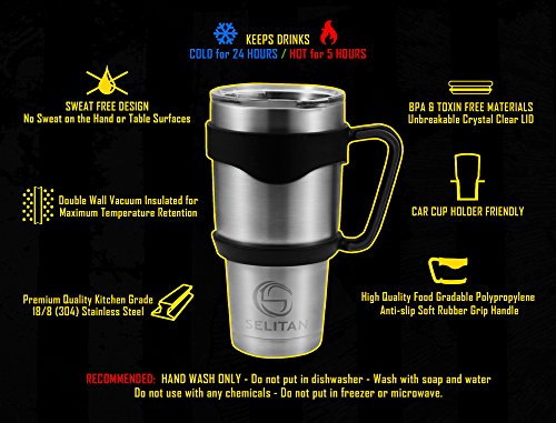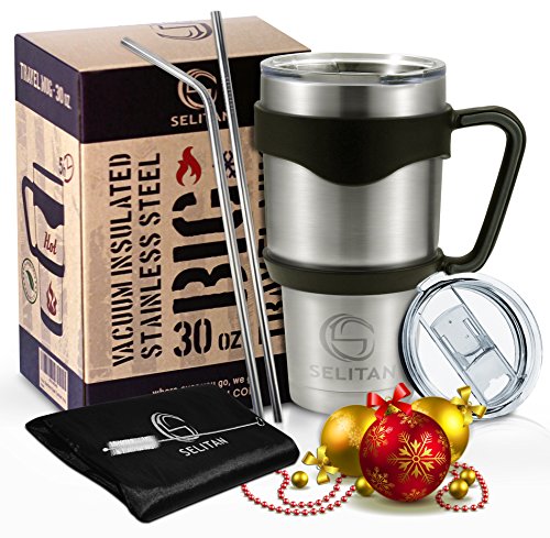 Stainless Steel Tumbler 30 Oz - Double Wall Vacuum Insulated Travel Mug with Handle, Two Tritan Lids, Two Straws, Cleaning Brush & Storage Bag. Keep Beverages Hot or Cold. by SELITAN