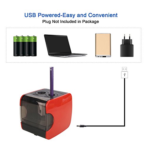 Multiple power sources: Use it as a battery operated pencil sharpener (4 x AA Batteries not included) or an electronic pencil sharpener using AC plug-in (not included) via USB cable (included). It also can be used as a USB powered pencil sharpener.