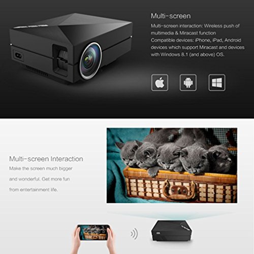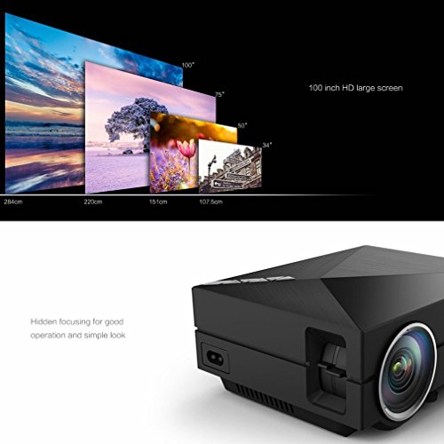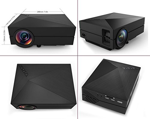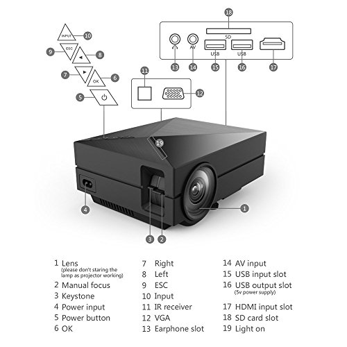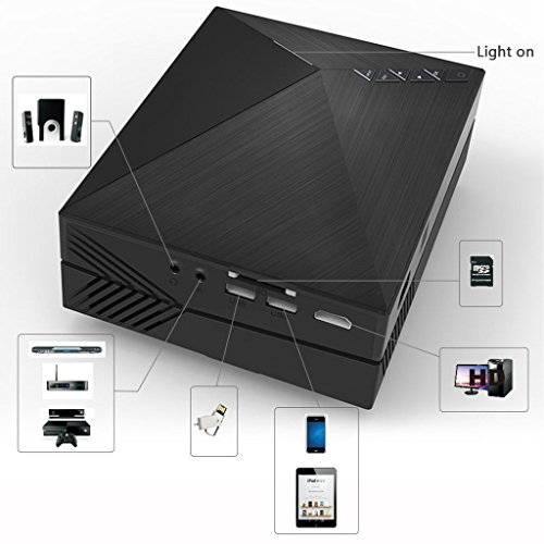-. Feature : Need to use in dark environment, Not recommended for PPT or business presentation, ideal for home theater movies and video game use / 50W low power cost; the fan will make noise to Radiating due to the highly temperature / Over 30,000 hours LED lamp life; Resolution:800x480; Brightness:1000 Lumens; Projection Ratio:1.4:1,Support aspect Ratio 4:3/16:9, Lens:F=125, Picture size: 34~130inches, Projection distance:1~4.0m(Sest distance:1~2M) / Multimedia Player Support File Formats: Video format(3GP/AVI/MKV/FLV/MOV/MP4/MPG/VOB/MPG/RMVB/RM), Audio fromat(MP3/WMA/WAV/ASF/OGG/ACC), Image format(JPEG/BMP/PNG), TEXT format(TXT) / Video projector, come with a HDMI cable. Support USB/AV/SD/VGA Interface, 3.5mm earphone port. The USB port is only for U-Disk/Hard Disk Device connecting