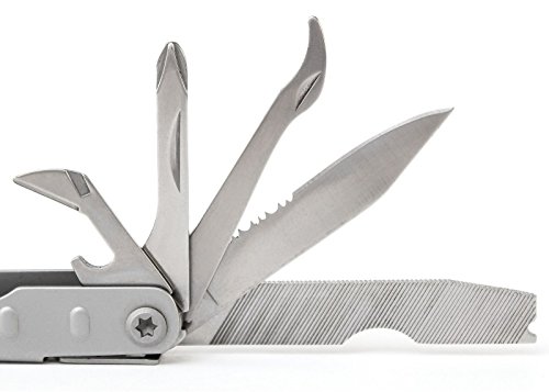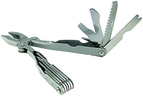 Amazon.com A handy tool for the homeowner, outdoor enthusiast, and practically everyone else, the Schrade Tough Tool 21 Function Multi-tool comes with durable stainless steel construction and 21 separate tools. Individual tools include needlenose pliers, a wire cutter, a bottle opener, a can opener, a locking Phillips screwdriver, a scribe/awl, a locking dual-edge blade, a file, a measuring gauge, a hook disgorger, a locking field saw, a scraping blade, a wire stripper, a locking large flathead screwdriver, a small flathead screwdriver, and a lanyard attachment. While using the needlenose pliers, the rest of the individual functions remain comfortably hidden in the tool's stainless steel handles. Measuring 4-3/4 inches closed, this tool comes with a convenient nylon sheath and a limited lifetime warranty. 0