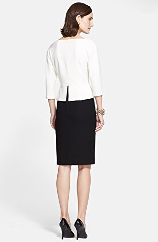 A richly textured knit pattern marries a cream peplum top to a black pencil skirt in this effortlessly sophisticated mock two-piece dress.