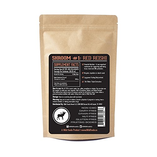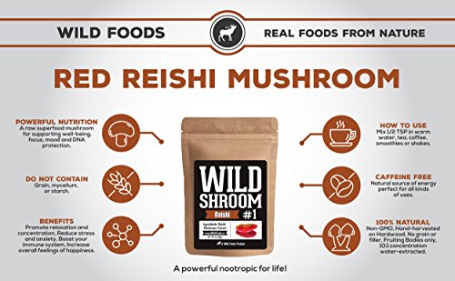 -. Feature : POWERFUL HEALTH PROMOTER: Reishi is packed with antioxidants and synergistic constituents that can protect against sleep disorders, fatigue, poor detoxification, inflammation and can even promote body oxygenation! It is the most widely studied natural substance on the planet. / POTENT ADAPTOGEN HERB: The most favored adaptogenic herb used in modern society. Adaptogens are substances that promote bodily resistance to stressors and increase recovery time to life's natural challenges. Adapotens support the body to positively respond to depleted energy levels, hormonal imbalances, increased inflammation and similar stresses. / QUALITY PROCESSING: Wild Reishi is Non-GMO, Grain-Free, Caffeine-Free, 100% Natural, Hand-Harvested, Small-Batch, with Fruiting Body Only. Wild Reishi Powder is a 10:1 concentration extract processed from reishi mushrooms cultivated on hardwood trees by small multigenerational farmers. / MULTITUDE OF USES: Mushroom powder is extremely versatile and can be added to coffee, tea, smoothies, shakes, soups, raw chocolate, and more. Add 2g (½ tsp) to each serving and enjoy! / Use code WILDSAVE at checkout when you Buy 2, 3, 4, 5, 6, 7 or more products and receive a larger discount the more you stock up! Mix and match any Wild Foods products. 100% MONEY-BACK GUARANTEE in the unlikely event you are not fully satisfied... simply return your purchase for a full refund.