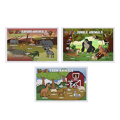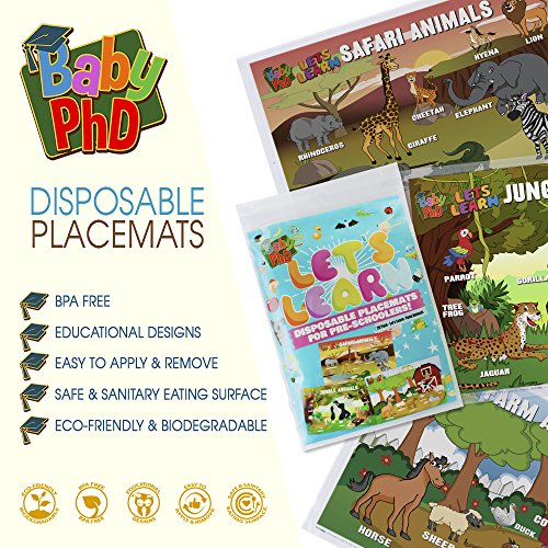 -. Binding : Baby Product -. Feature : THREE EDUCATIONAL DESIGNS - Use these mats as not only an opportunity to entertain to your child but to educate them on Farm Animals, Jungle Animals and Safari Animals / FOUR SIDED STICKY STRIPS - Never worry about this disposable baby placemat staying in place. 4 sticky strips ensure the children's placemat stays where you want it until your child is finished! / DISPOSABLE PLACEMATS: Our Let's Learn Series baby place mats are made from biodegradable and eco-friendly materials. / LARGE & INDIVIDUALLY FOLDED - The 12" X 18" individually folded disposable placemats make it easy to pull out just one of the 12" x 18" table toppers out of the bag at a time! / SAFETY FIRST: Our products are safe against harms of Lead and Phthalates (CPSIA compliant). These placemats are BPA free. -. Label : Baby PhD -. Manufacturer : Baby PhD -. Model : Animals -. NumberOfItems : 3 -. ProductGroup : Baby Product -. ProductTypeName : BABY_PRODUCT -. Publisher : Baby PhD -. Studio : Baby PhD -. Title : Disposable Placemats by Baby Phd - Table Top Mats for Toddlers Kids Children and Babies - Extra Sticky Adhesive - 60 Placemats - Eco Friendly - 3 Neat Educational Animal Designs - Sticks To Table