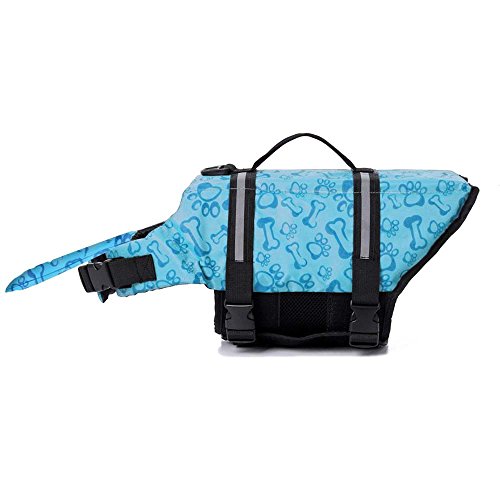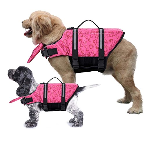 -. Feature : Function & Safety: LANDGOO dog life jacket is the ultimate in canine flotation and water safety for dogs that love to join their humans rafting, kayaking, boating, surfing and paddle boarding. It provides a comfortable and secure fit for tons of fun in the water. / Extra Padding under your dog's chin enables strong buoyance and safety guarantee and helps your furry kid not to drink or get water in their mouth. Easy-Grab Handles make getting your dog in and out of the water easier by hand, provides better night time safety. The Hook & Loop can protect the dogs from straps going around their chest to prevent sore spots from rubbing. / High Grade Material: Thicker materials, better stitching and higher quality leash loops provide a better life jacket for your dog. Made with two layers of flotation material, the oxford nylon fabric is rip stop and allows for quick drying and proper drainage. / Reflective Detail: Removable front float assists in keeping pup's head above water. Reflective stripes/adjustable belt & quick-release buckles design for comfortable and secure fit, easy to put on and take off. The Heavy-duty D-ring Hook is perfect for dog leash. / Colors: Extra Bright Safety Colors enhanced visibility in or out of the water at night or in dark places. Blue/Pink Bone or pure yellow patterns will make your pup look stylish.