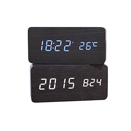 Pard Stylish Black Wood LED Alarm Clock with Voice Control Function and Temperature, Time and Date Display, Blue Display