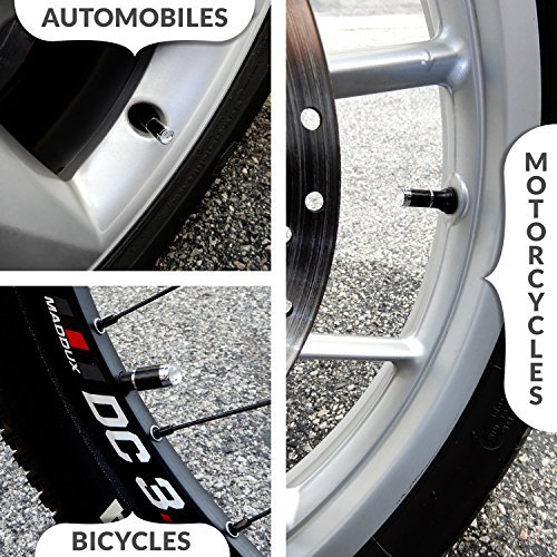 - UNIVERSAL FIT: Sparkle Rider’s custom black and chrome carbon fiber tire valve caps fit standard SCHRADER VALVES and are perfect for your CAR, TRUCK, SUV, ATV, TRIKE, MOTORCYCLE, and wider rimmed BICYCLE; Note they are NOT RECOMMENDED for vehicles equipped with TPMS (tire pressure monitoring system); To avoid damaging the threads make sure not to over tighten.