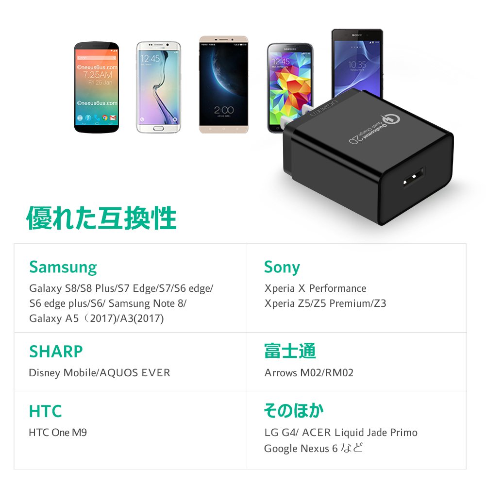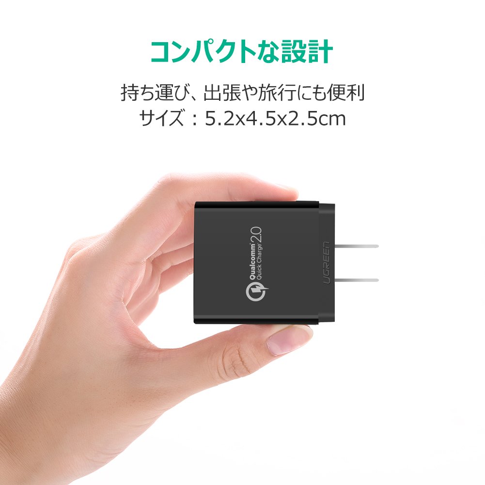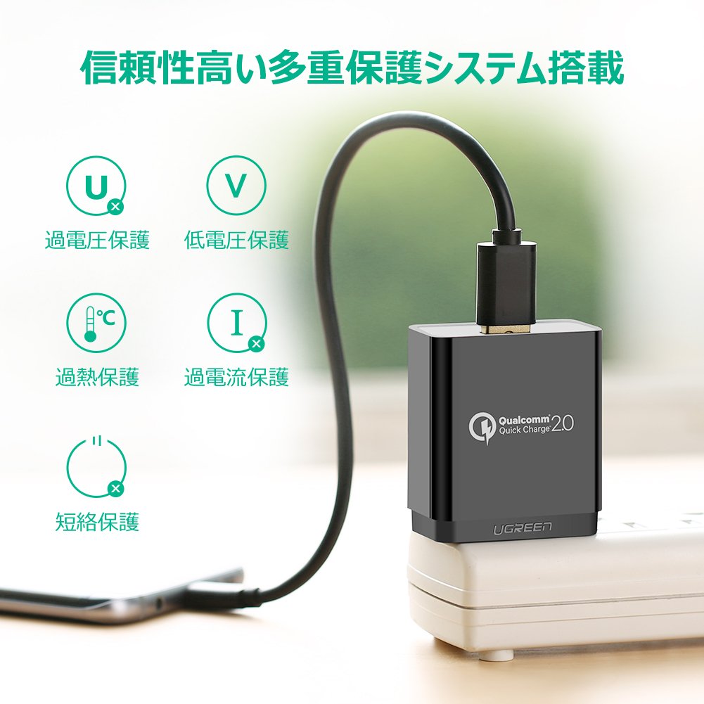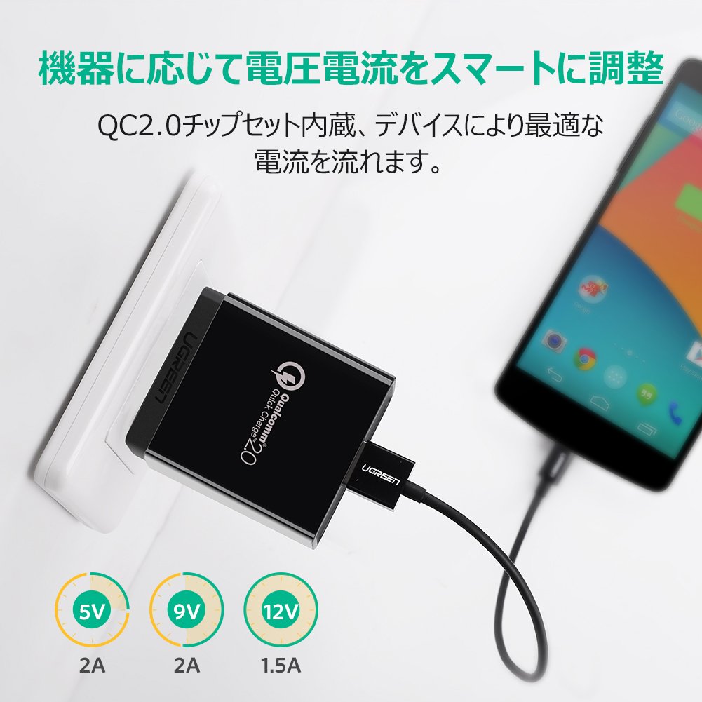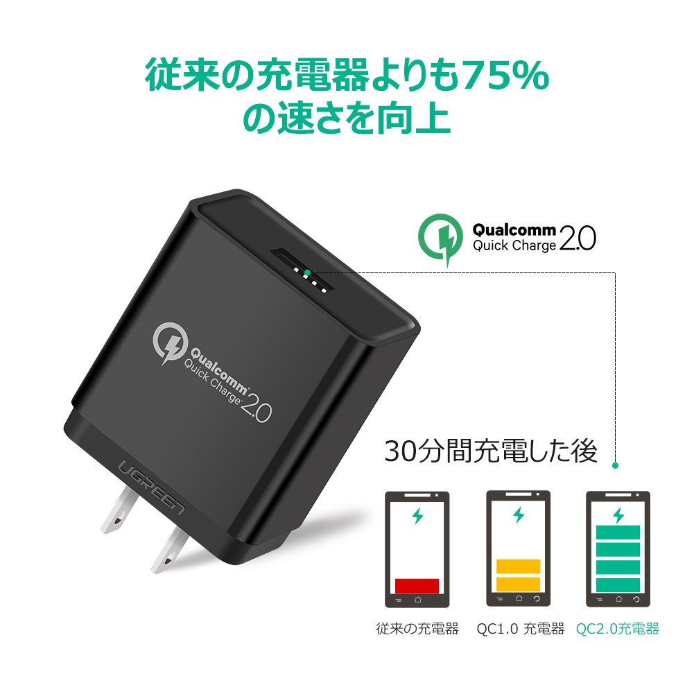 The UGREEN USB quick charger will be able to charge at high speed by raising the charge voltage (9 V) in accordance with Qualcomm Quick Charge 2.0 technology.
