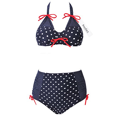 Feature : Fast Ship(FBA):Fulfilled by Amazon with two-day Shipping (Ship from USA) / Adjustable halter neck / Pattern:Retro Polka Dot White Black Vintage High Waist Bikini Halter Swimsuit / Package Includes: 1 x Swimsuits / Saslax own it's TradeMark