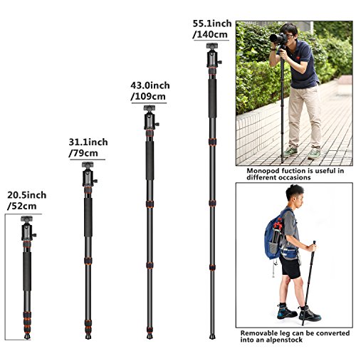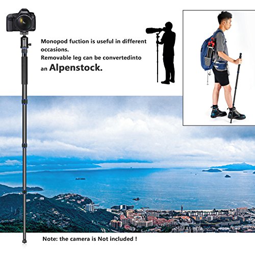 2-in-1 Stativ. Wird ein Bein entfernt, kann es als Monopod verwendet und in einen Bergstock umgewandelt werden.