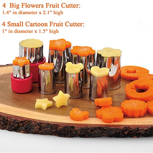 8 Multifunction Fruit Cutter in Different Size: 4 big different flowers and 4 small cartoon cutters for your selection,suit for meals,cake,biscuit,cookie,sushi,fruit,pudding,vegetable,butterfly noodle and more.Best for kids toast lunch or various appetizers. Perfectly designed for all kinds of occasions,such as birthday,Halloween,Valentine’s day,thanksgiving,Christmas,classroom projects and so on.