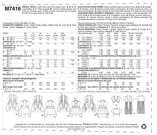 -. Title : MCCALLS M7416 Y MISSES VEST SIZE LARGE-XLARGE-XXLARGE SEWING PATTERN