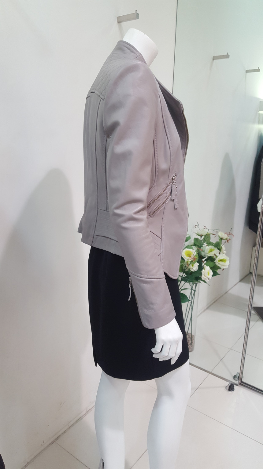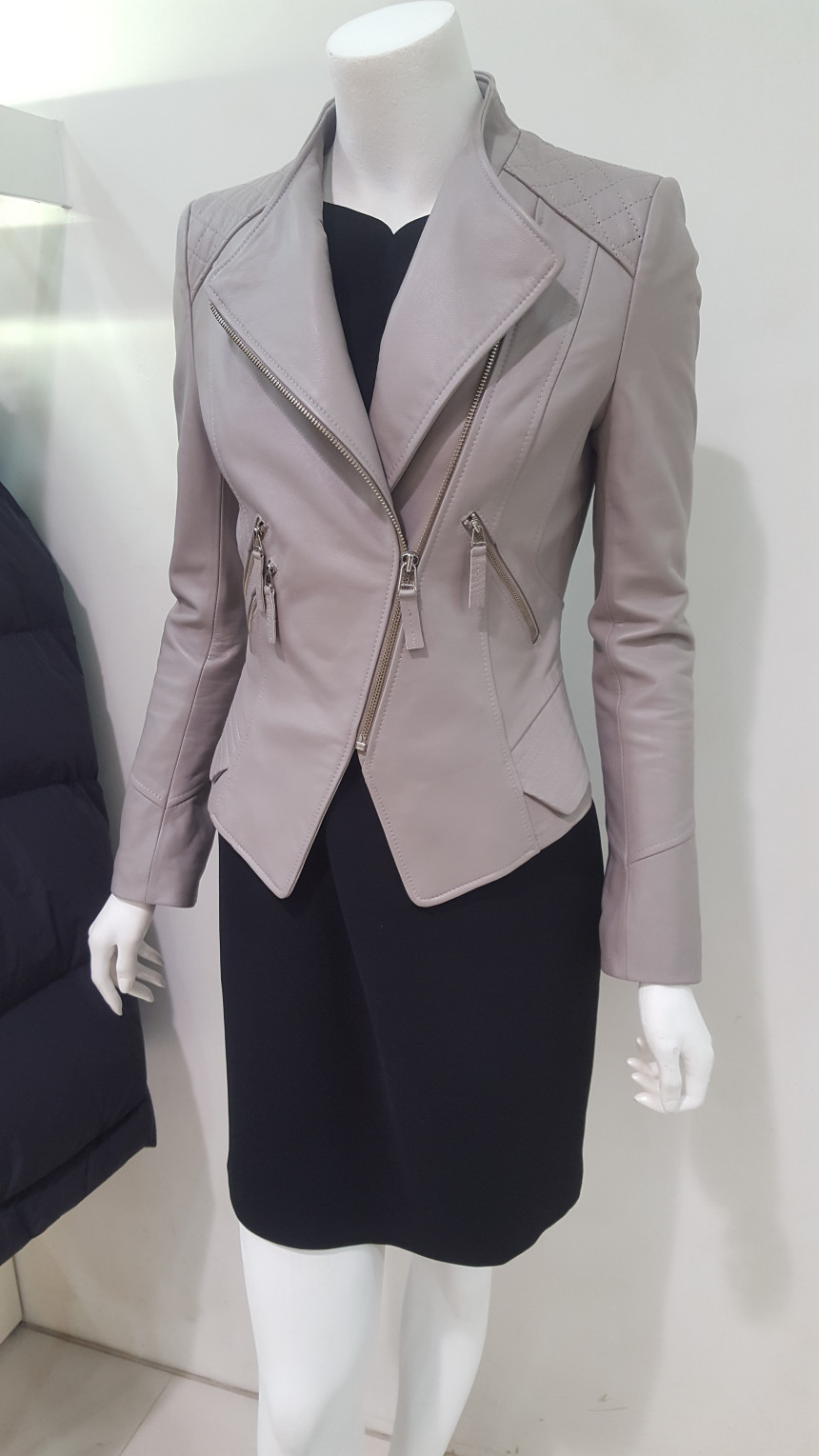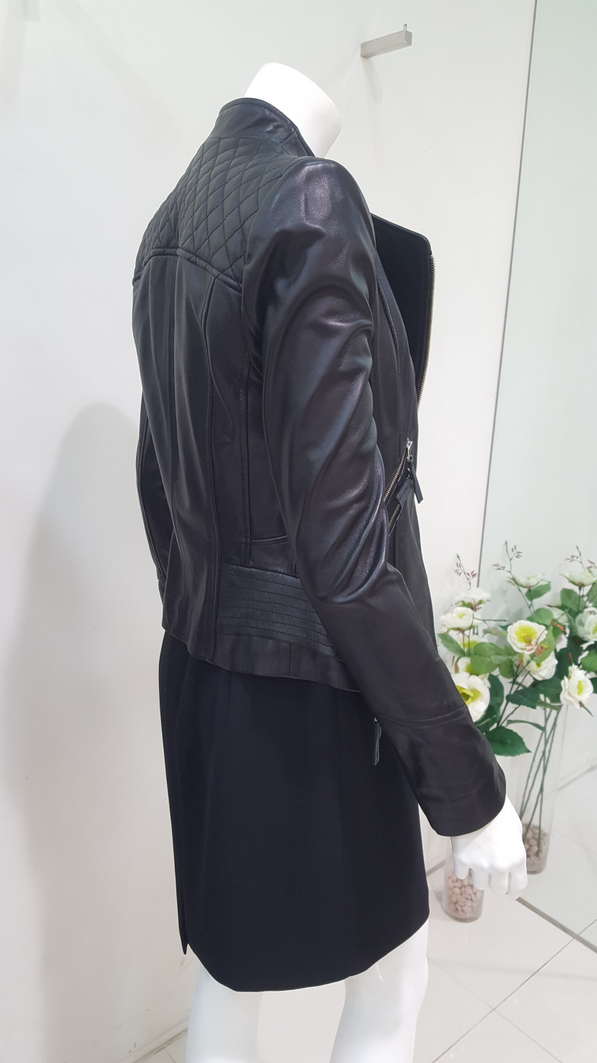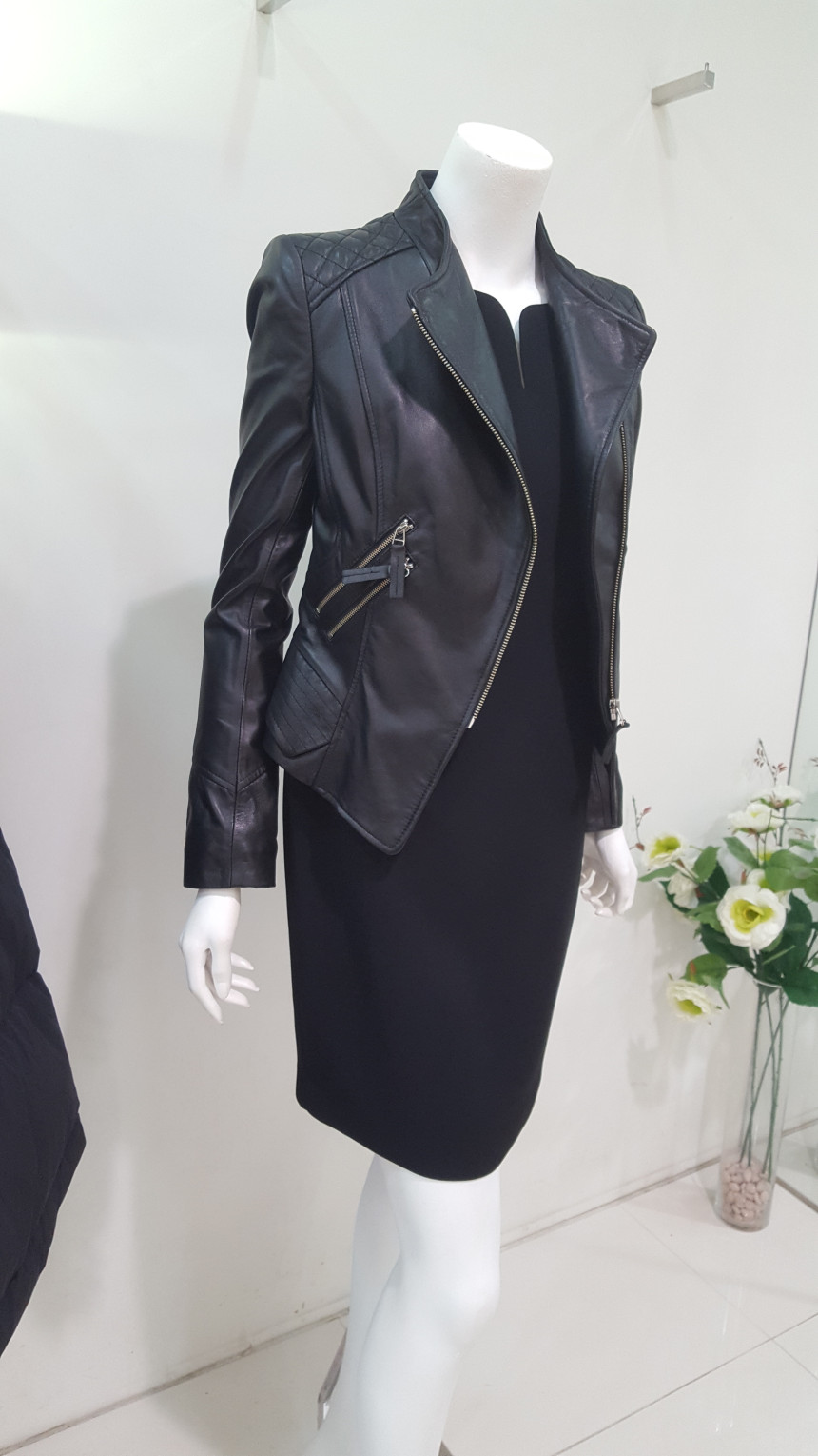 카라가 넓지 않는차이나 카라넥 스타일의 가죽 자킷으로여성스럽고 사선으로 떨어지는