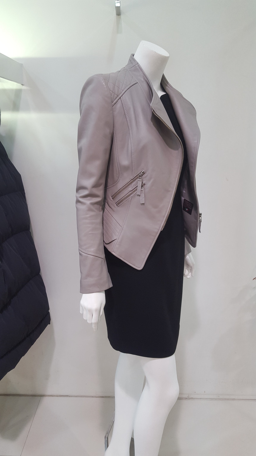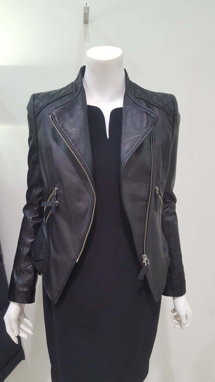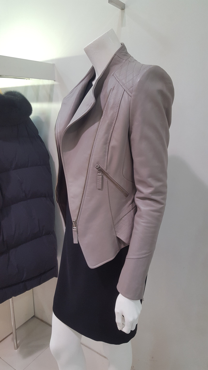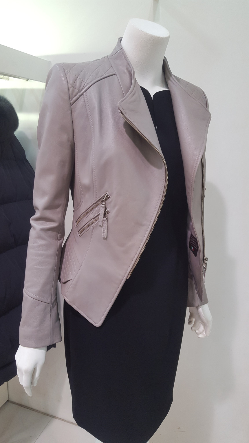 카라가 넓지 않는차이나 카라넥 스타일의 가죽 자킷으로여성스럽고 사선으로 떨어지는